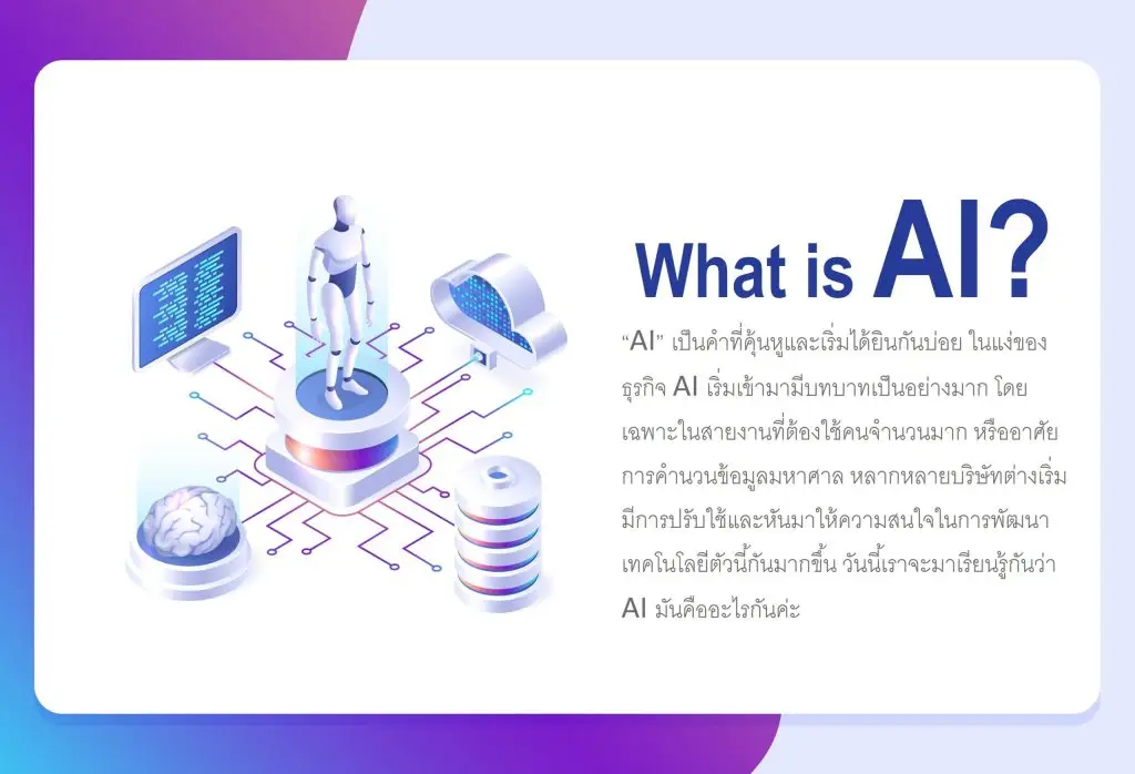 “AI” เป็นคำที่คุ้นหูและเริ่มได้ยินกันบ่อย ในแง่ของธุรกิจ AI เริ่มเข้ามามีบทบาทเป็นอย่างมาก โดยเฉพาะในสายงานที่ต้องใช้คนจำนวนมาก หรืออาศัยการคำนวนข้อมูลมหาศาล หลากหลายบริษัทต่างเริ่มมีการปรับใช้และหันมาให้ความสนใจในการพัฒนาเทคโนโลยีตัวนี้กันมากขึ้น วันนี้เราจะมาเรียนรู้กันว่า AI มันคืออะไรกันค่ะ
